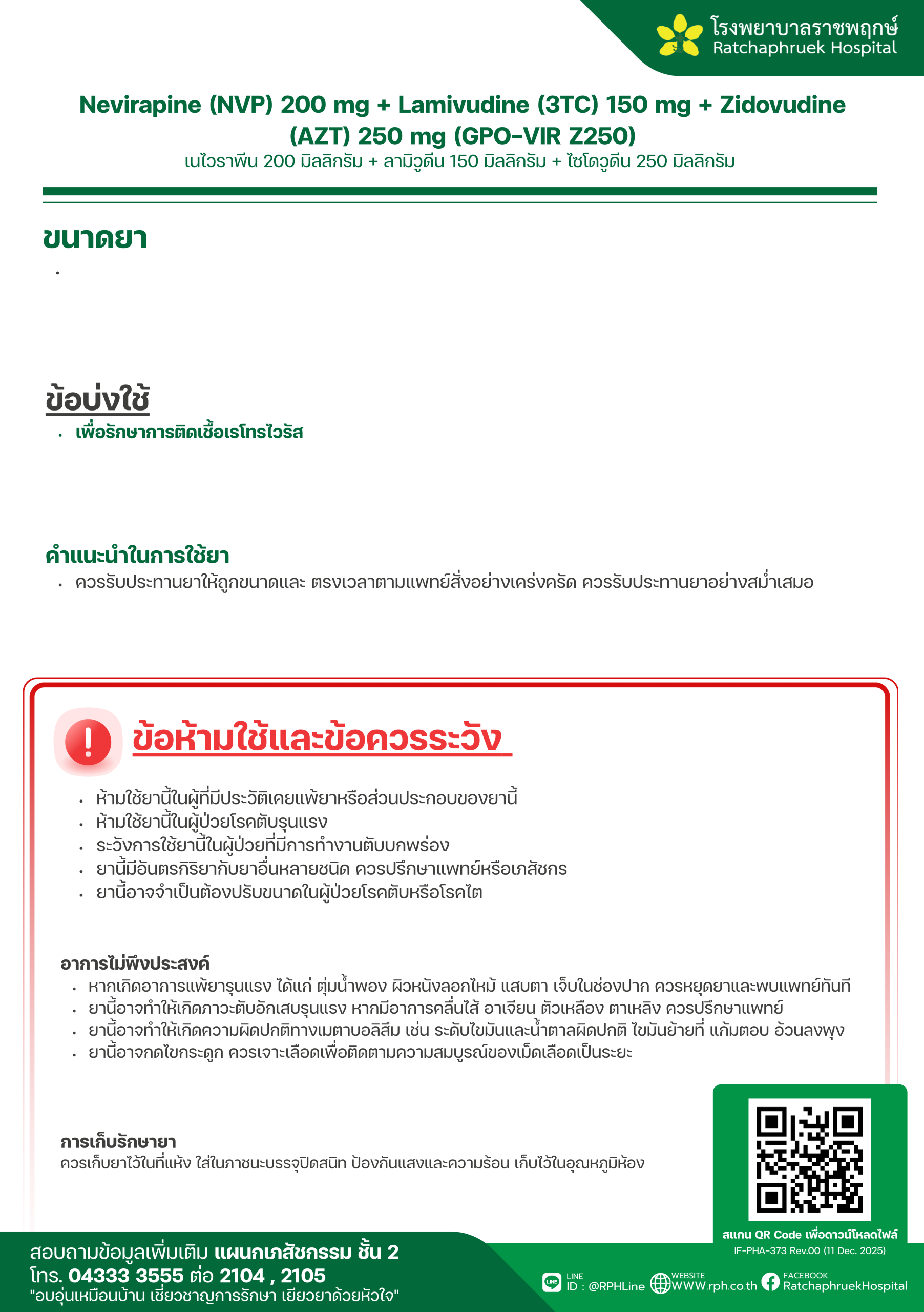 Drug Information Nevirapine (NVP) 200 mg + Lamivudine (3TC) 150 mg + Zidovudine (AZT) 250 mg (GPO-VIR Z250) (เนไวราพีน ลามิวูดีน และไซโดวูดีน ) เมื่อวันที่ 27 มกราคม 2569