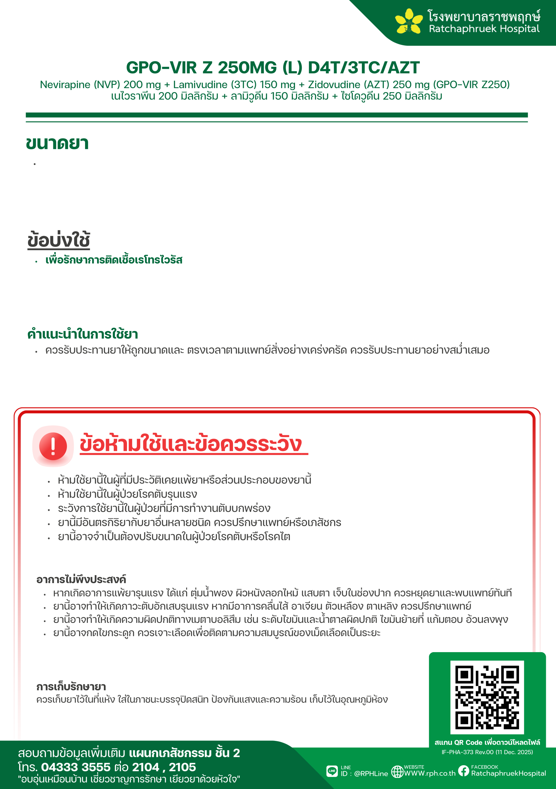Drug Information Nevirapine (NVP) 200 mg + Lamivudine (3TC) 150 mg + Stavudine (d4T) 30 mg (GPO vir -S30) (เนไวราพีน ,ลามิวูดีน และสแตวูดีน) เมื่อวันที่ 26 มกราคม 2569