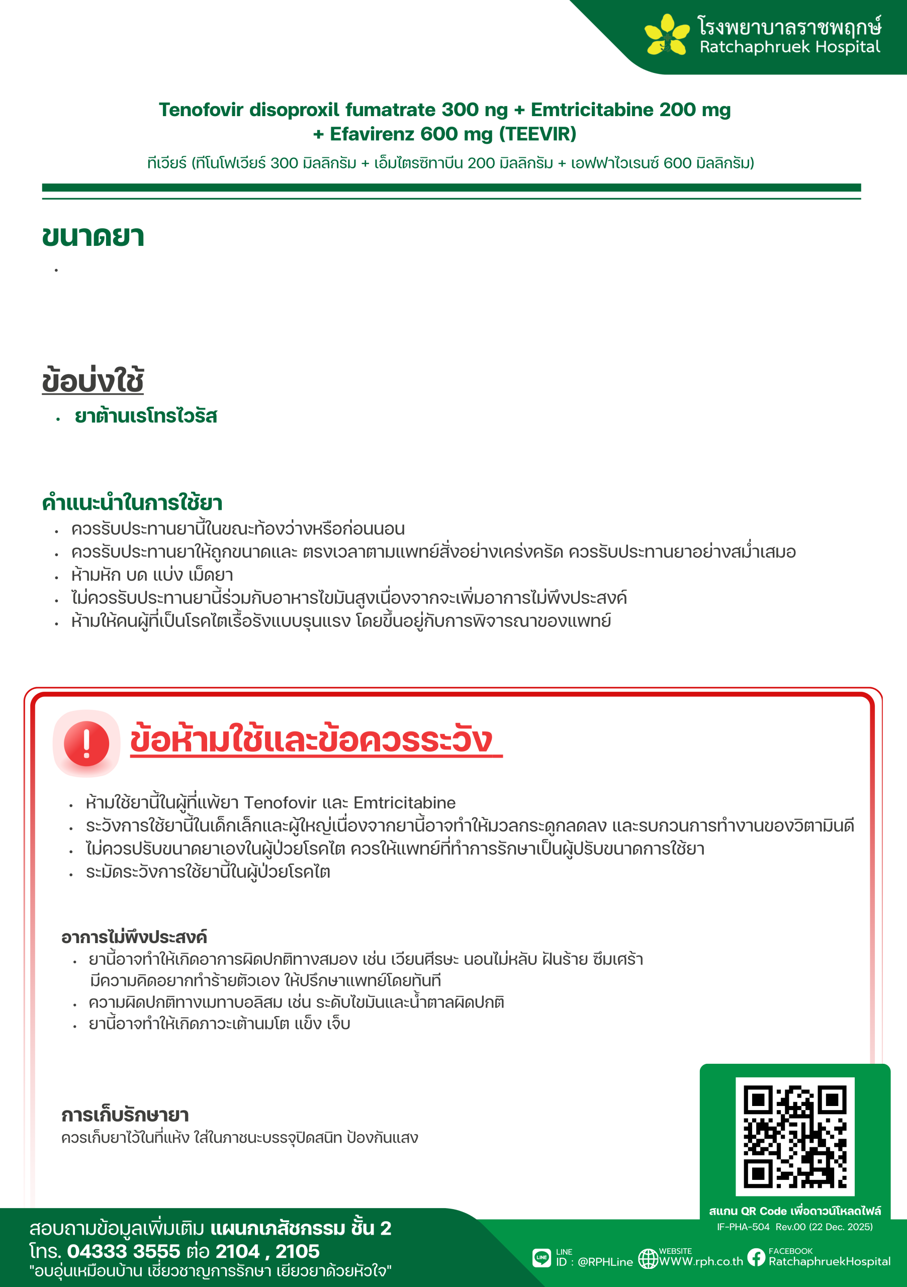 Drug Information Tenofovir disoproxil fumatrate 300 ng + Emtricitabine 200 mg + Efavirenz 600 mg (TEEVIR) (ทีเวียร์) เมื่อวันที่ 30 มกราคม 2569