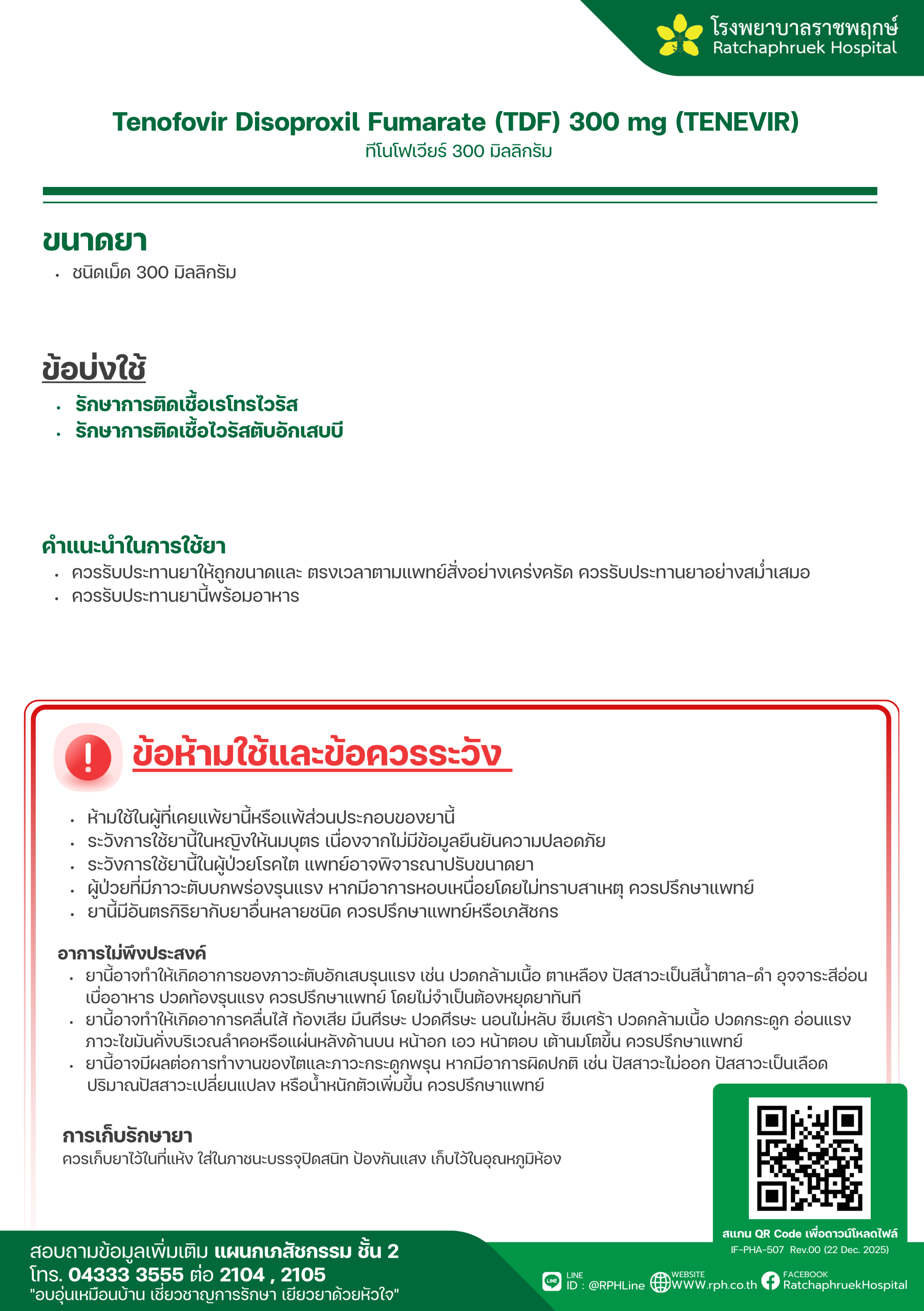 Drug Information Tenofovir Disoproxil Fumarate (TDF) 300 mg (TENEVIR) (ทีโนโฟเวียร์) เมื่อวันที่ 30 มกราคม 2569