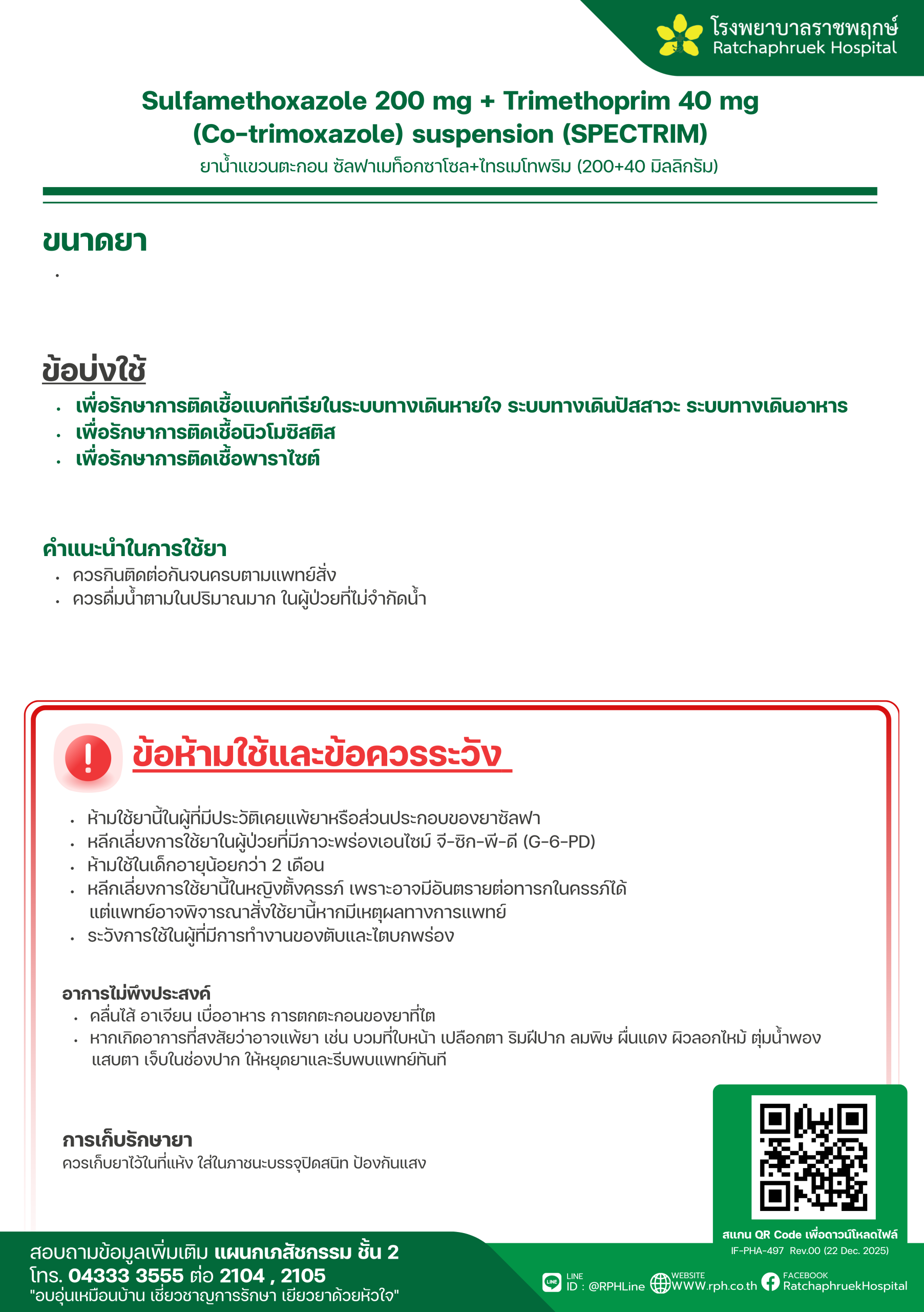 Drug Information Sulfamethoxazole 200 mg + Trimethoprim 40 mg (Co-trimoxazole) suspension (SPECTRIM) (ยาน้ำแขวนตะกอน ซัลฟาเมท็อกซาโซล และไทรเมโทพริม) เมื่อวันที่ 30 มกราคม 2569
