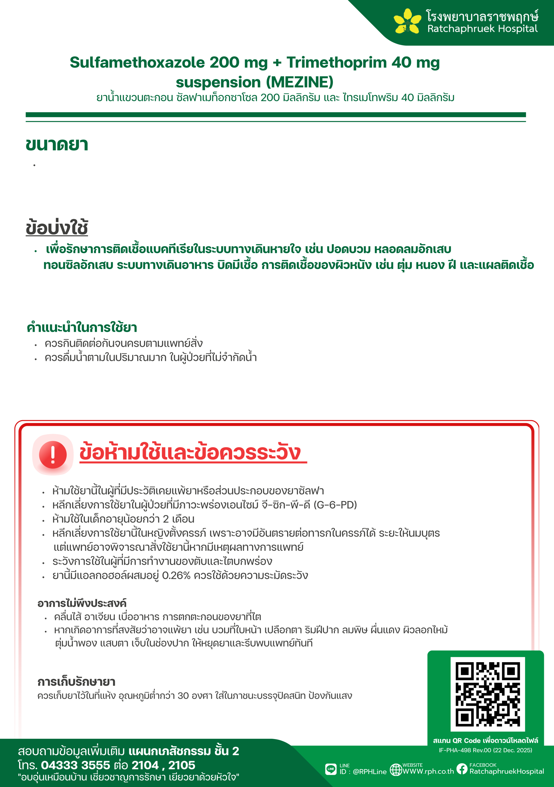 Drug Information Sulfamethoxazole 200 mg + Trimethoprim 40 mg suspension (MEZINE) (ยาน้ำแขวนตะกอน ซัลฟาเมท็อกซาโซล และไทรเมโทพริม) เมื่อวันที่ 30 มกราคม 2569