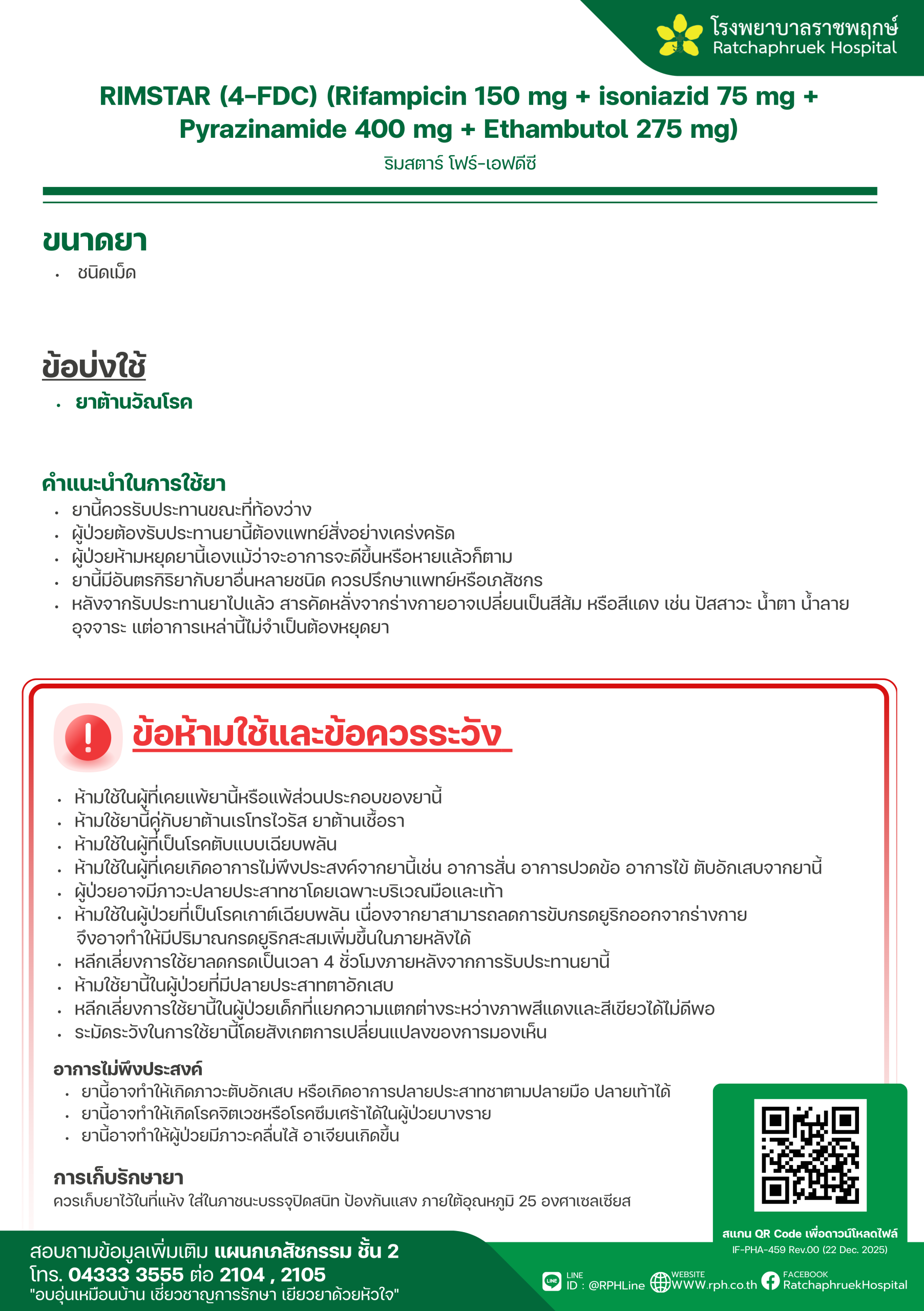 Drug Information RIMSTAR (4-FDC) (Rifampicin 150 mg + isoniazid 75 mg + Pyrazinamide 400 mg + Ethambutol 275 mg) (ริมสตาร์ โฟร์-เอฟดีซี) เมื่อวันที่ 29 มกราคม 2569