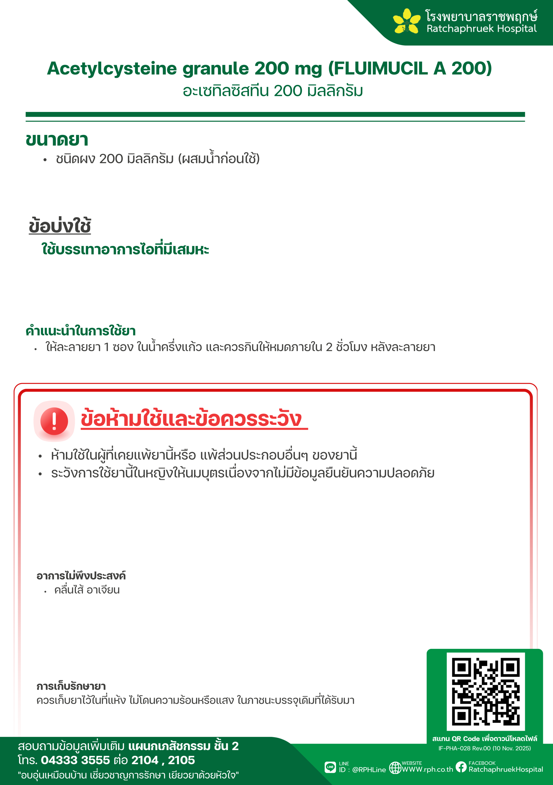 Drug Information Acetylcysteine granule 200 mg (FLUIMUCIL A 200) (อะเซทิลซิสทีน) เมื่อวันที่ 30 ธันวาคม 2568